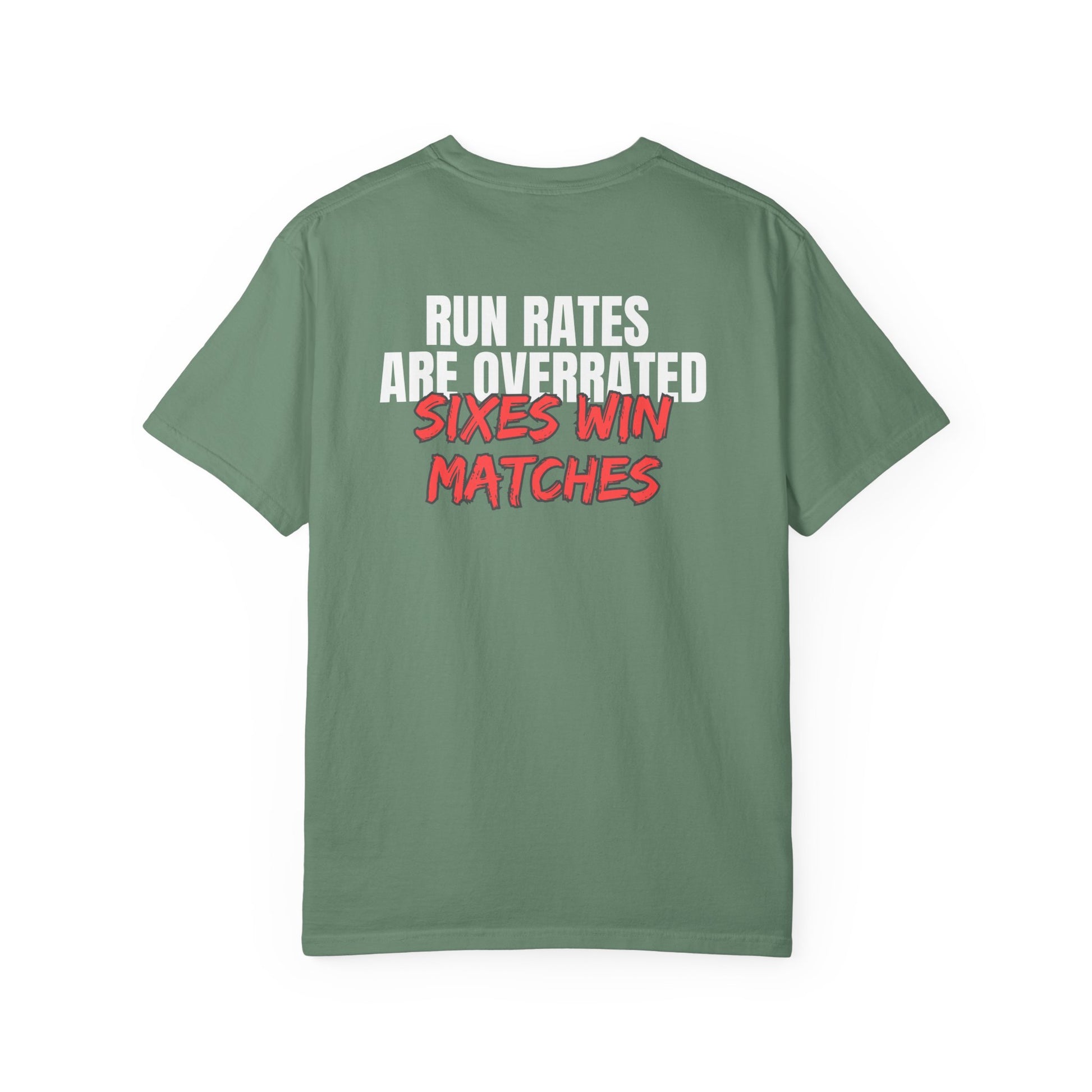 Run Rates Are Overrated “Sixes Win Matches” T-Shirt — Cricket Humor Tee (Heavyweight Garment-Dyed)